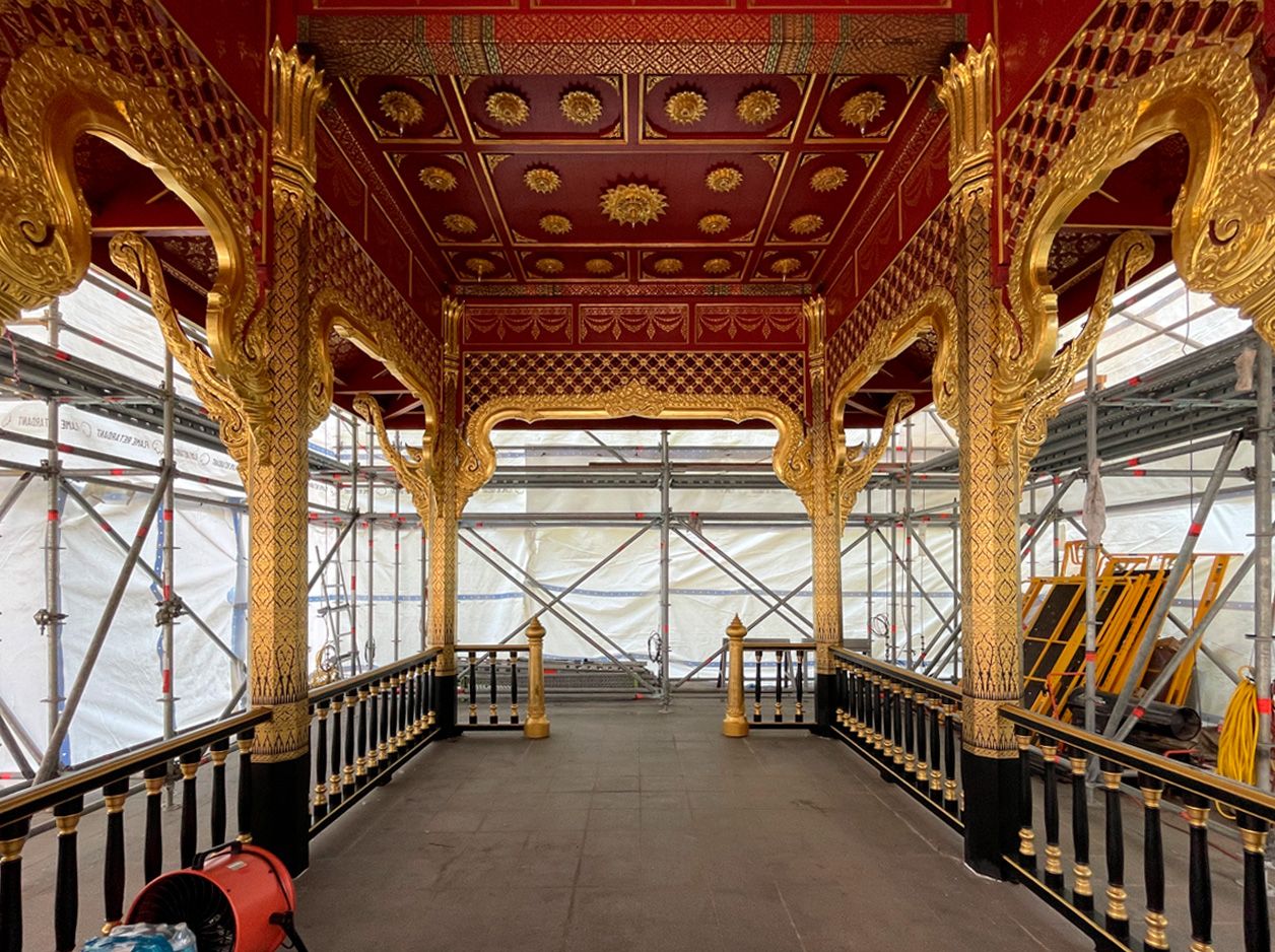 La intervención en el Royal Thai Pavilion no se limita a estos aspectos. En esta segunda fase de los trabajos, el equipo de Kalam también se está encargando de la restauración de otros elementos decorativos, como los detalles en mosaico espejado que forman parte de la ornamentación del edificio. Estas piezas, esenciales para mantener la integridad visual del pabellón, serán restauradas utilizando técnicas especializadas que respetan al máximo los materiales y métodos originales.